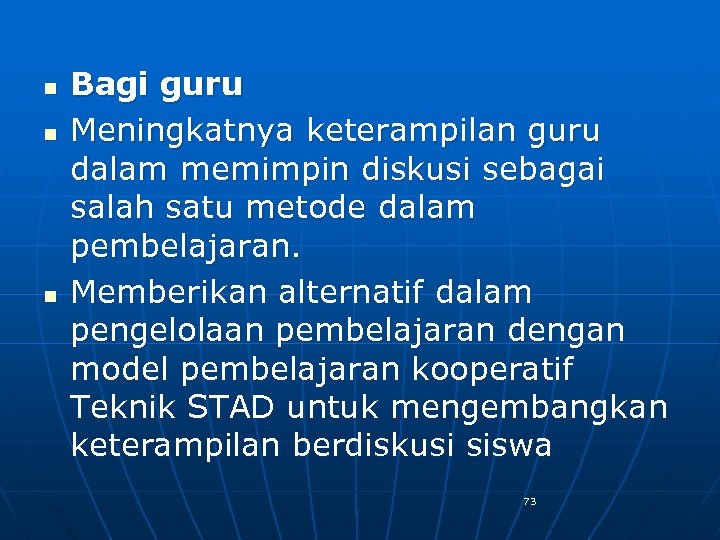 n n n Bagi guru Meningkatnya keterampilan guru dalam memimpin diskusi sebagai salah satu metode dalam pembelajaran. Memberikan alternatif dalam pengelolaan pembelajaran dengan model pembelajaran kooperatif Teknik STAD untuk mengembangkan keterampilan berdiskusi siswa 73