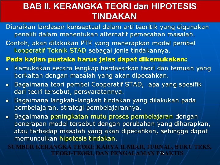 BAB II. KERANGKA TEORI dan HIPOTESIS TINDAKAN Diuraikan landasan konseptual dalam arti teoritik yang digunakan peneliti dalam menentukan alternatif pemecahan masalah. Contoh, akan dilakukan PTK yang menerapkan model pembel kooperatif Teknik STAD sebagai jenis tindakannya. Pada kajian pustaka harus jelas dapat dikemukakan: n Kemukakan secara lengkap berdasarkan teori dan temuan yang berkaitan dengan masalah yang akan dipecahkan. n Bagaimana teori pembel Cooperatif STAD, apa yang spesifik dari teori tersebut, persyaratannya. n Bagaimana langkah-langkah tindakan yang dilakukan pada pembelajaran, strategi pembelajarannya. n Bagaimana peningkatan mutu proses pembelajaran dengan penerapan model tersebut dengan perubahan yang diharapkan, atau terhadap masalah yang akan dipecahkan, sehingga dapat memunculkan hipotesis tindakan. SUMBER KERANGKA TEORI: KARYA ILMIAH, JURNAL, BUKU TEKS, 74 TEORI-TEORI, DAN PENGALAMAN PRAKTIS