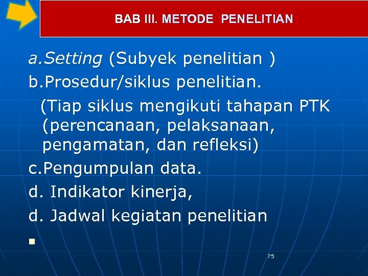 BAB III. METODE PENELITIAN a. Setting (Subyek penelitian ) b. Prosedur/siklus penelitian. (Tiap siklus mengikuti tahapan PTK (perencanaan, pelaksanaan, pengamatan, dan refleksi) c. Pengumpulan data. d. Indikator kinerja, d. Jadwal kegiatan penelitian n 75