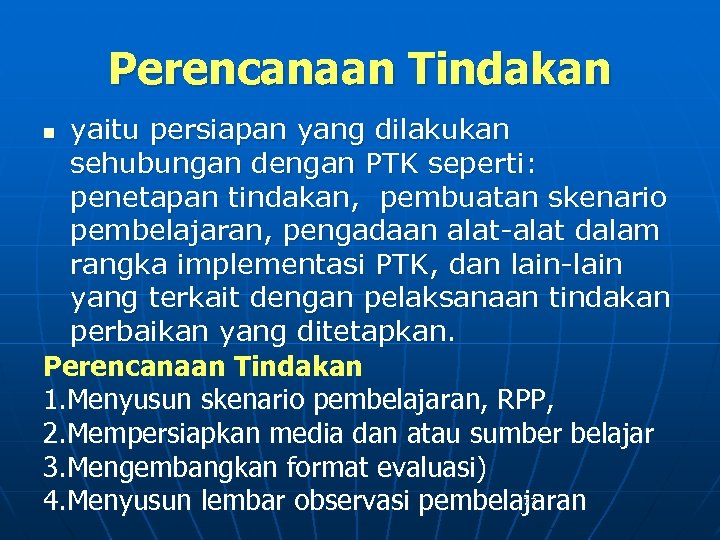 Perencanaan Tindakan yaitu persiapan yang dilakukan sehubungan dengan PTK seperti: penetapan tindakan, pembuatan skenario pembelajaran, pengadaan alat-alat dalam rangka implementasi PTK, dan lain-lain yang terkait dengan pelaksanaan tindakan perbaikan yang ditetapkan. Perencanaan Tindakan 1. Menyusun skenario pembelajaran, RPP, 2. Mempersiapkan media dan atau sumber belajar 3. Mengembangkan format evaluasi) 4. Menyusun lembar observasi pembelajaran n 77
