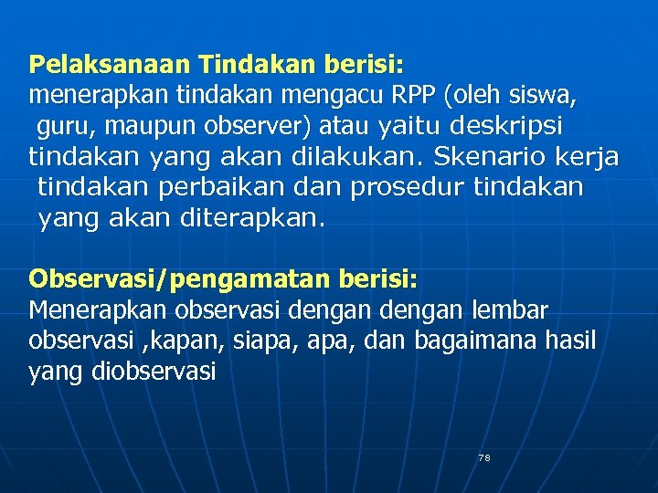 Pelaksanaan Tindakan berisi: menerapkan tindakan mengacu RPP (oleh siswa, guru, maupun observer) atau yaitu deskripsi tindakan yang akan dilakukan. Skenario kerja tindakan perbaikan dan prosedur tindakan yang akan diterapkan. Observasi/pengamatan berisi: Menerapkan observasi dengan lembar observasi , kapan, siapa, dan bagaimana hasil yang diobservasi 78