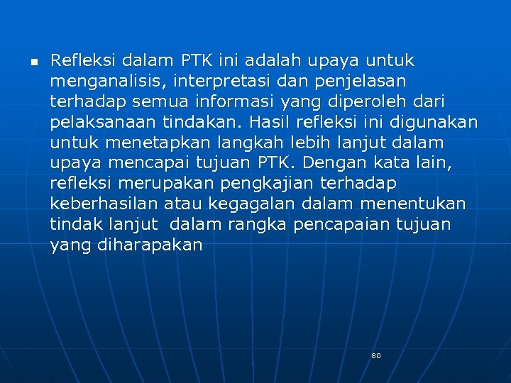 n Refleksi dalam PTK ini adalah upaya untuk menganalisis, interpretasi dan penjelasan terhadap semua informasi yang diperoleh dari pelaksanaan tindakan. Hasil refleksi ini digunakan untuk menetapkan langkah lebih lanjut dalam upaya mencapai tujuan PTK. Dengan kata lain, refleksi merupakan pengkajian terhadap keberhasilan atau kegagalan dalam menentukan tindak lanjut dalam rangka pencapaian tujuan yang diharapakan 80
