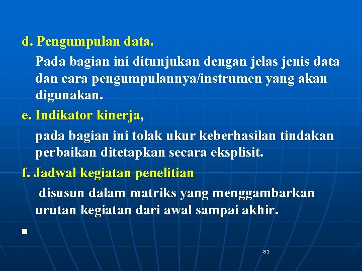 d. Pengumpulan data. Pada bagian ini ditunjukan dengan jelas jenis data dan cara pengumpulannya/instrumen yang akan digunakan. e. Indikator kinerja, pada bagian ini tolak ukur keberhasilan tindakan perbaikan ditetapkan secara eksplisit. f. Jadwal kegiatan penelitian disusun dalam matriks yang menggambarkan urutan kegiatan dari awal sampai akhir. n 81