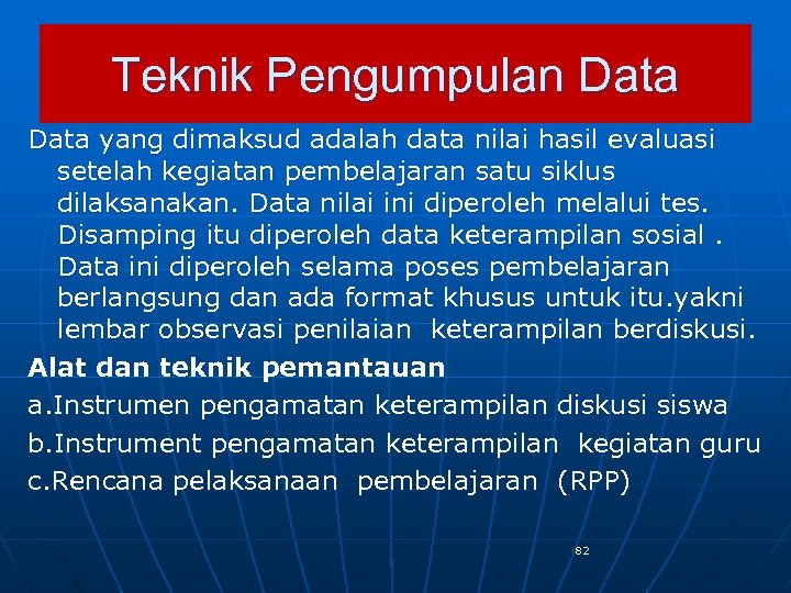 Teknik Pengumpulan Data yang dimaksud adalah data nilai hasil evaluasi setelah kegiatan pembelajaran satu siklus dilaksanakan. Data nilai ini diperoleh melalui tes. Disamping itu diperoleh data keterampilan sosial. Data ini diperoleh selama poses pembelajaran berlangsung dan ada format khusus untuk itu. yakni lembar observasi penilaian keterampilan berdiskusi. Alat dan teknik pemantauan a. Instrumen pengamatan keterampilan diskusi siswa b. Instrument pengamatan keterampilan kegiatan guru c. Rencana pelaksanaan pembelajaran (RPP) 82