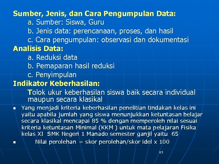 Sumber, Jenis, dan Cara Pengumpulan Data: a. Sumber: Siswa, Guru b. Jenis data: perencanaan, proses, dan hasil c. Cara pengumpulan: observasi dan dokumentasi Analisis Data: a. Reduksi data b. Pemaparan hasil reduksi c. Penyimpulan Indikator Keberhasilan: Tolok ukur keberhasilan siswa baik secara individual maupun secara klasikal n n Yang menjadi kriteria keberhasilan penelitian tindakan kelas ini yaitu apabila jumlah yang siswa menunjukkan ketuntasan belajar secara klasikal mencapai 85 % dengan memperoleh nilai sesuai kriteria ketuntasan Minimal (KKM ) untuk mata pelajaran Fisika kelas XI SMK Negeri 1 Manado semester ganjil yaitu 65 Nilai perolehan = skor perolehan/skor idel x 100 83