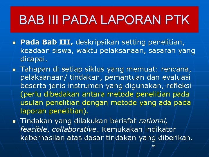 BAB III PADA LAPORAN PTK n n n Pada Bab III, deskripsikan setting penelitian, keadaan siswa, waktu pelaksanaan, sasaran yang dicapai. Tahapan di setiap siklus yang memuat: rencana, pelaksanaan/ tindakan, pemantuan dan evaluasi beserta jenis instrumen yang digunakan, refleksi (perlu dibedakan antara metode penelitian pada usulan penelitian dengan metode yang ada pada laporan penelitian). Tindakan yang dilakukan berisfat rational, feasible, collaborative. Kemukakan indikator keberhasilan atas dasar tindakan yang diberikan. 84