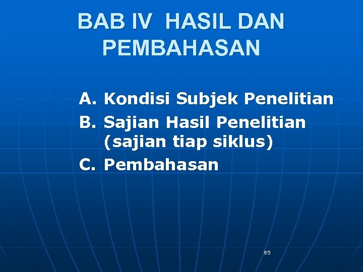 BAB IV HASIL DAN PEMBAHASAN A. Kondisi Subjek Penelitian B. Sajian Hasil Penelitian (sajian tiap siklus) C. Pembahasan 85