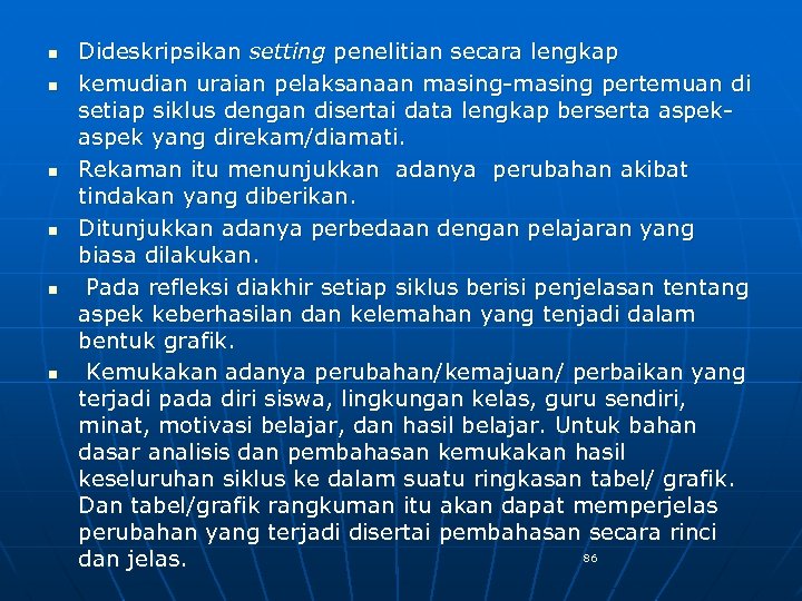 n n n Dideskripsikan setting penelitian secara lengkap kemudian uraian pelaksanaan masing-masing pertemuan di setiap siklus dengan disertai data lengkap berserta aspek yang direkam/diamati. Rekaman itu menunjukkan adanya perubahan akibat tindakan yang diberikan. Ditunjukkan adanya perbedaan dengan pelajaran yang biasa dilakukan. Pada refleksi diakhir setiap siklus berisi penjelasan tentang aspek keberhasilan dan kelemahan yang tenjadi dalam bentuk grafik. Kemukakan adanya perubahan/kemajuan/ perbaikan yang terjadi pada diri siswa, lingkungan kelas, guru sendiri, minat, motivasi belajar, dan hasil belajar. Untuk bahan dasar analisis dan pembahasan kemukakan hasil keseluruhan siklus ke dalam suatu ringkasan tabel/ grafik. Dan tabel/grafik rangkuman itu akan dapat memperjelas perubahan yang terjadi disertai pembahasan secara rinci 86 dan jelas.