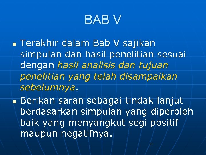 BAB V n n Terakhir dalam Bab V sajikan simpulan dan hasil penelitian sesuai dengan hasil analisis dan tujuan penelitian yang telah disampaikan sebelumnya. Berikan saran sebagai tindak lanjut berdasarkan simpulan yang diperoleh baik yang menyangkut segi positif maupun negatifnya. 87