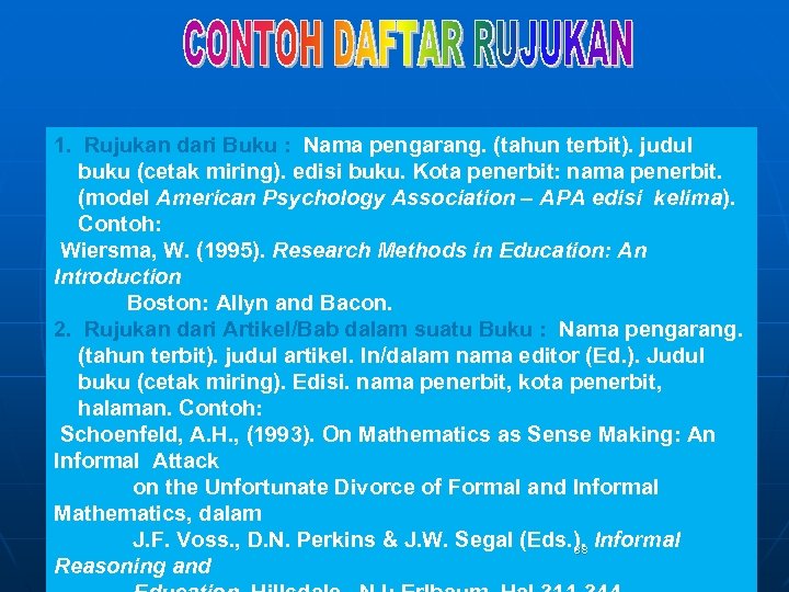 1. Rujukan dari Buku : Nama pengarang. (tahun terbit). judul buku (cetak miring). edisi buku. Kota penerbit: nama penerbit. (model American Psychology Association – APA edisi kelima). Contoh: Wiersma, W. (1995). Research Methods in Education: An Introduction Boston: Allyn and Bacon. 2. Rujukan dari Artikel/Bab dalam suatu Buku : Nama pengarang. (tahun terbit). judul artikel. In/dalam nama editor (Ed. ). Judul buku (cetak miring). Edisi. nama penerbit, kota penerbit, halaman. Contoh: Schoenfeld, A. H. , (1993). On Mathematics as Sense Making: An Informal Attack on the Unfortunate Divorce of Formal and Informal Mathematics, dalam J. F. Voss. , D. N. Perkins & J. W. Segal (Eds. ). Informal 88 Reasoning and