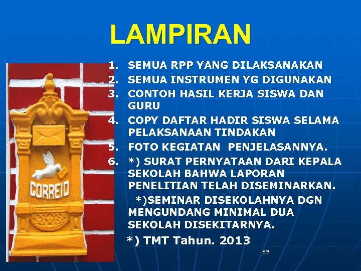 LAMPIRAN 1. SEMUA RPP YANG DILAKSANAKAN 2. SEMUA INSTRUMEN YG DIGUNAKAN 3. CONTOH HASIL KERJA SISWA DAN GURU 4. COPY DAFTAR HADIR SISWA SELAMA PELAKSANAAN TINDAKAN 5. FOTO KEGIATAN PENJELASANNYA. 6. *) SURAT PERNYATAAN DARI KEPALA SEKOLAH BAHWA LAPORAN PENELITIAN TELAH DISEMINARKAN. *)SEMINAR DISEKOLAHNYA DGN MENGUNDANG MINIMAL DUA SEKOLAH DISEKITARNYA. *) TMT Tahun. 2013 89