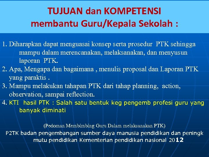 TUJUAN dan KOMPETENSI membantu Guru/Kepala Sekolah : 1. Diharapkan dapat menguasai konsep serta prosedur PTK sehingga mampu dalam merencanakan, melaksanakan, dan menyusun laporan PTK. 2. Apa, Mengapa dan bagaimana , menulis proposal dan Laporan PTK yang paraktis. 3. Mampu melakukan tahapan PTK dari tahap planning, action, observation, sampai reflection. 4. KTI hasil PTK : Salah satu bentuk keg pengemb profesi guru yang banyak diminati (Pedoman Membimbing Guru Dalam melaksanakan PTK) P 2 TK badan pengembangan sumber daya manusia pendidikan dan peningk mutu pendidikan Kementerian pendidikan nasional 2012