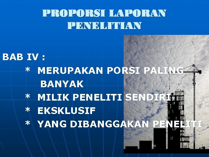 PROPORSI LAPORAN PENELITIAN BAB IV : * MERUPAKAN PORSI PALING BANYAK * MILIK PENELITI SENDIRI * EKSKLUSIF * YANG DIBANGGAKAN PENELITI 90