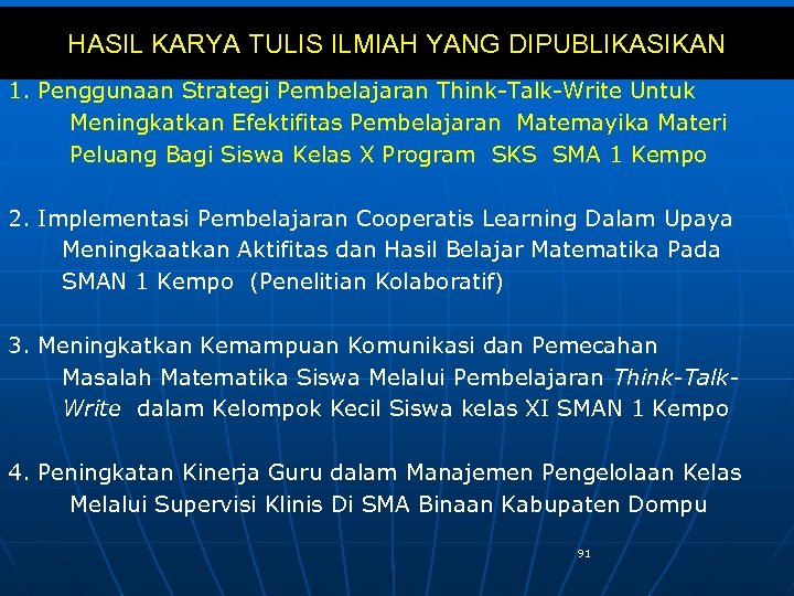 HASIL KARYA TULIS ILMIAH YANG DIPUBLIKASIKAN 1. Penggunaan Strategi Pembelajaran Think-Talk-Write Untuk Meningkatkan Efektifitas Pembelajaran Matemayika Materi Peluang Bagi Siswa Kelas X Program SKS SMA 1 Kempo 2. Implementasi Pembelajaran Cooperatis Learning Dalam Upaya Meningkaatkan Aktifitas dan Hasil Belajar Matematika Pada SMAN 1 Kempo (Penelitian Kolaboratif) 3. Meningkatkan Kemampuan Komunikasi dan Pemecahan Masalah Matematika Siswa Melalui Pembelajaran Think-Talk. Write dalam Kelompok Kecil Siswa kelas XI SMAN 1 Kempo 4. Peningkatan Kinerja Guru dalam Manajemen Pengelolaan Kelas Melalui Supervisi Klinis Di SMA Binaan Kabupaten Dompu 91
