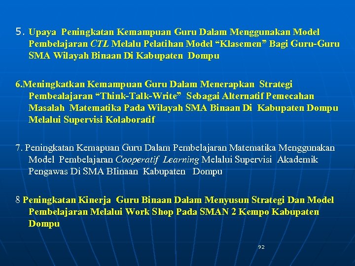 5. Upaya Peningkatan Kemampuan Guru Dalam Menggunakan Model Pembelajaran CTL Melalu Pelatihan Model “Klasemen” Bagi Guru-Guru SMA Wilayah Binaan Di Kabupaten Dompu 6. Meningkatkan Kemampuan Guru Dalam Menerapkan Strategi Pembealajaran “Think-Talk-Write” Sebagai Alternatif Pemecahan Masalah Matematika Pada Wilayah SMA Binaan Di Kabupaten Dompu Melalui Supervisi Kolaboratif 7. Peningkatan Kemapuan Guru Dalam Pembelajaran Matematika Menggunakan Model Pembelajaran Cooperatif Learning Melalui Supervisi Akademik Pengawas Di SMA BIinaan Kabupaten Dompu 8 Peningkatan Kinerja Guru Binaan Dalam Menyusun Strategi Dan Model Pembelajaran Melalui Work Shop Pada SMAN 2 Kempo Kabupaten Dompu 92