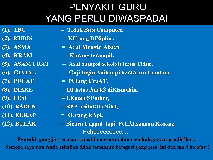 PENYAKIT GURU YANG PERLU DIWASPADAI (1). TBC = Tidak Bisa Computer. (2). KUDIS = KUrang DISiplin. (3). ASMA = ASal Mengisi Absen. (4). KRAM = Kurang terampil. (5). ASAM URAT = Asal Sampai sekolah terus Tidur. (6). GINJAL = Gaji Ingin Naik tapi ker. JAnya Lamban. (7). PUCAT = PUlang Cep. AT. (8). DIARE = DI kelas Anak 2 di. REmehin, (9). LESU = LEmah SUmber, (10). RABUN = RPP n sila. BUs Nihil, (11). KURAP = KUrang RApi, (12). BULAK = Bicara Unggul tapi Pe. LAksanaan Kosong Heheeeee…. . Penyakit yang justru akan semakin merusak dan membahayakan pendidikan. Semoga saya dan Anda sekalian tidak termasuk kategori yang satu ini dan mari belajar !