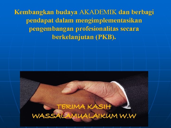 Kembangkan budaya AKADEMIK dan berbagi pendapat dalam mengimplementasikan pengembangan profesionalitas secara berkelanjutan (PKB). TERIMA KASIH WASSALAMUALAIKUM W. W 94