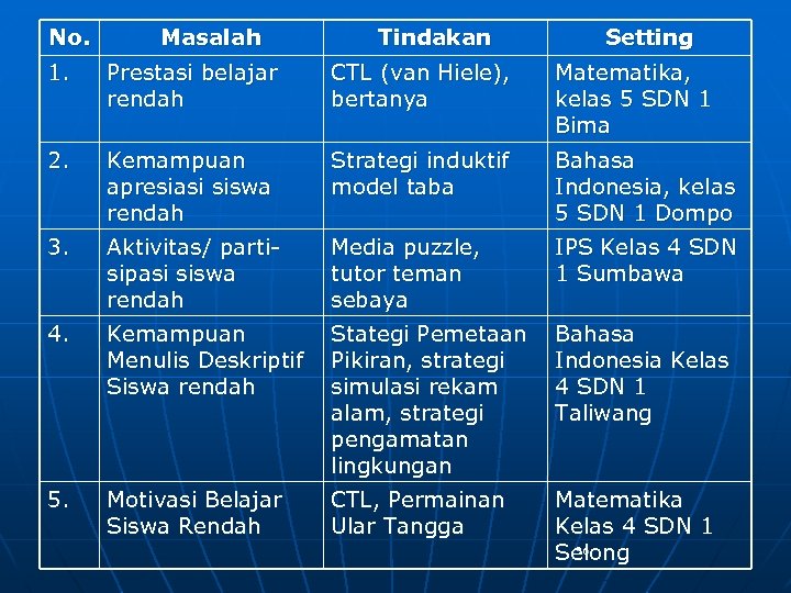 No. Masalah Tindakan Setting 1. Prestasi belajar rendah CTL (van Hiele), bertanya Matematika, kelas 5 SDN 1 Bima 2. Kemampuan apresiasi siswa rendah Strategi induktif model taba Bahasa Indonesia, kelas 5 SDN 1 Dompo 3. Aktivitas/ partisipasi siswa rendah Media puzzle, tutor teman sebaya IPS Kelas 4 SDN 1 Sumbawa 4. Kemampuan Stategi Pemetaan Bahasa Menulis Deskriptif Pikiran, strategi Indonesia Kelas Siswa rendah simulasi rekam 4 SDN 1 alam, strategi Taliwang pengamatan lingkungan 5. Motivasi Belajar Siswa Rendah CTL, Permainan Ular Tangga Matematika Kelas 4 SDN 1 96 Selong