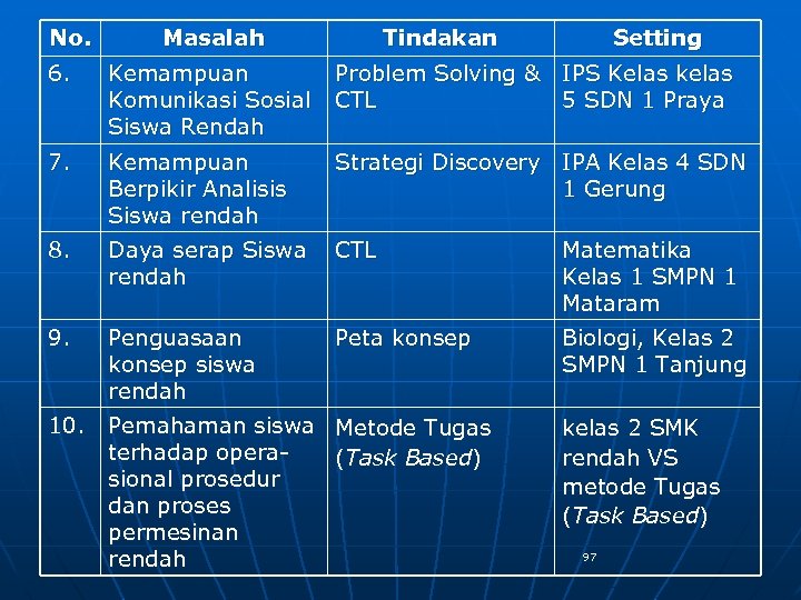 No. Masalah Tindakan Setting 6. Kemampuan Problem Solving & IPS Kelas kelas Komunikasi Sosial CTL 5 SDN 1 Praya Siswa Rendah 7. Kemampuan Berpikir Analisis Siswa rendah 8. Daya serap Siswa CTL rendah Matematika Kelas 1 SMPN 1 Mataram 9. Penguasaan konsep siswa rendah Biologi, Kelas 2 SMPN 1 Tanjung 10. Pemahaman siswa Metode Tugas terhadap opera(Task Based) sional prosedur dan proses permesinan rendah Strategi Discovery IPA Kelas 4 SDN 1 Gerung Peta konsep kelas 2 SMK rendah VS metode Tugas (Task Based) 97