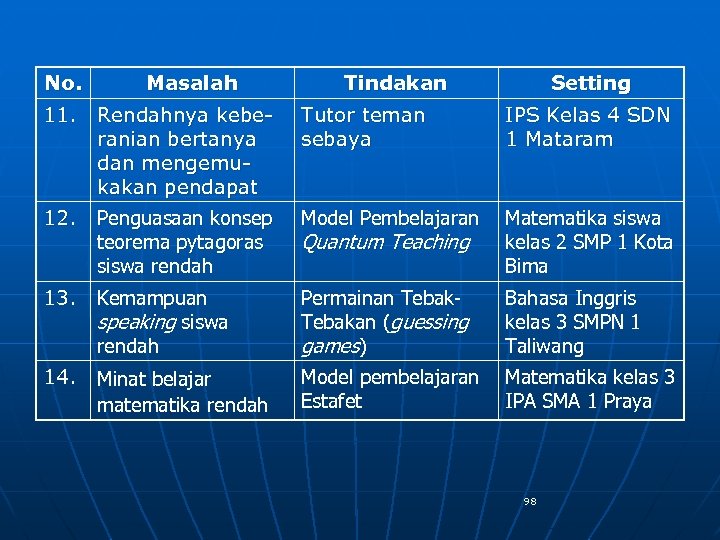 No. Masalah Tindakan Setting 11. Rendahnya keberanian bertanya dan mengemukakan pendapat Tutor teman sebaya IPS Kelas 4 SDN 1 Mataram 12. Penguasaan konsep teorema pytagoras siswa rendah Model Pembelajaran Quantum Teaching Matematika siswa kelas 2 SMP 1 Kota Bima 13. Kemampuan speaking siswa rendah Permainan Tebakan (guessing games) Bahasa Inggris kelas 3 SMPN 1 Taliwang 14. Minat belajar matematika rendah Model pembelajaran Estafet Matematika kelas 3 IPA SMA 1 Praya 98