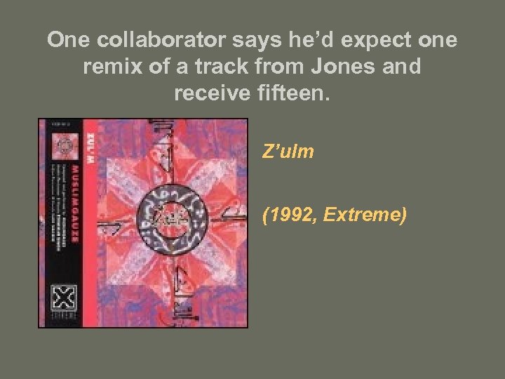 One collaborator says he’d expect one remix of a track from Jones and receive fifteen. Z’ulm (1992, Extreme)
