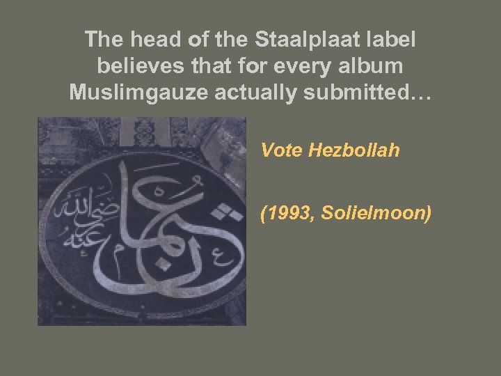 The head of the Staalplaat label believes that for every album Muslimgauze actually submitted… Vote Hezbollah (1993, Solielmoon)