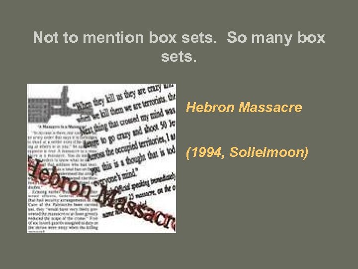 Not to mention box sets. So many box sets. Hebron Massacre (1994, Solielmoon)