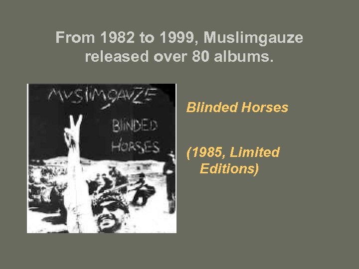 From 1982 to 1999, Muslimgauze released over 80 albums. Blinded Horses (1985, Limited Editions)