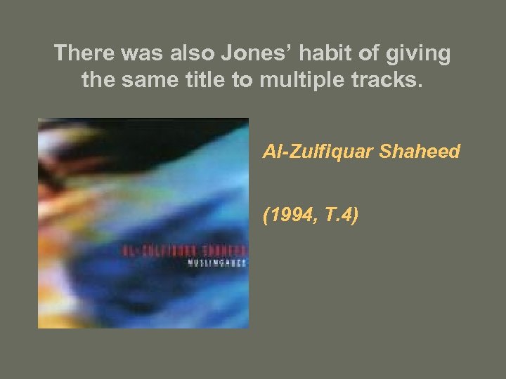 There was also Jones’ habit of giving the same title to multiple tracks. Al-Zulfiquar Shaheed (1994, T. 4)