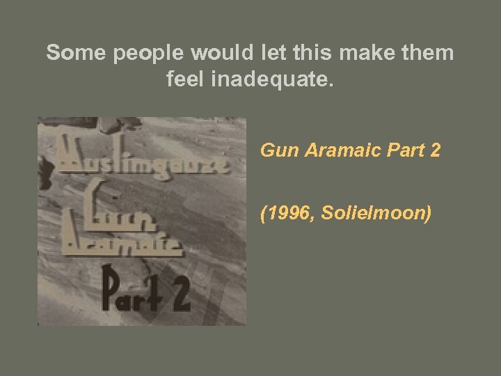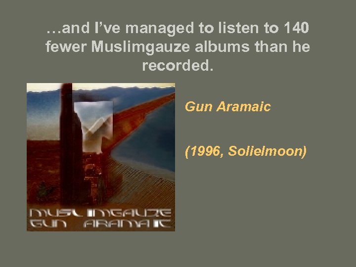 …and I’ve managed to listen to 140 fewer Muslimgauze albums than he recorded. Gun Aramaic (1996, Solielmoon)
