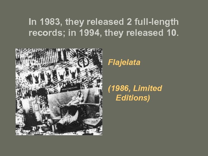 In 1983, they released 2 full-length records; in 1994, they released 10. Flajelata (1986, Limited Editions)