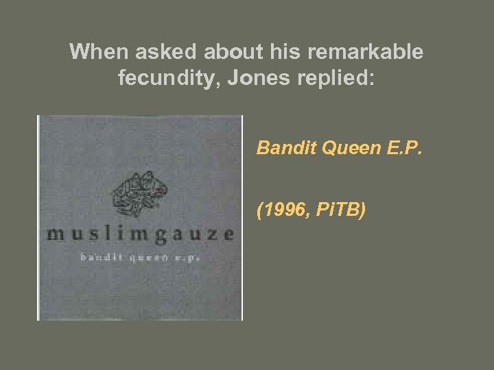When asked about his remarkable fecundity, Jones replied: Bandit Queen E. P. (1996, Pi. TB)