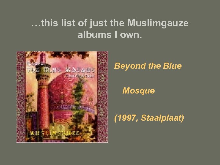 …this list of just the Muslimgauze albums I own. Beyond the Blue Mosque (1997, Staalplaat)