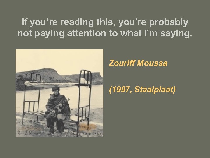 If you’re reading this, you’re probably not paying attention to what I’m saying. Zouriff Moussa (1997, Staalplaat)