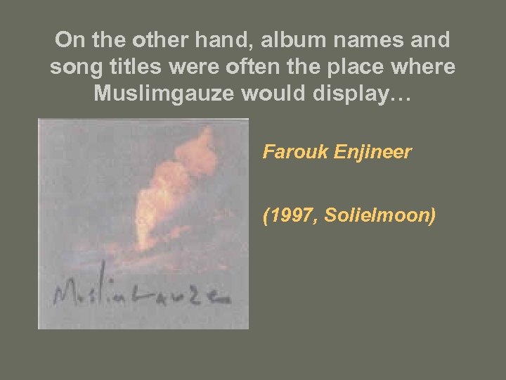 On the other hand, album names and song titles were often the place where Muslimgauze would display… Farouk Enjineer (1997, Solielmoon)