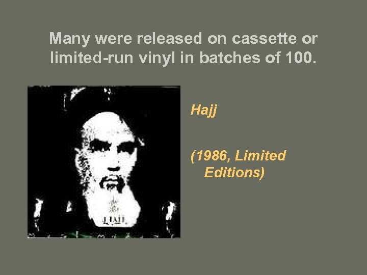 Many were released on cassette or limited-run vinyl in batches of 100. Hajj (1986, Limited Editions)