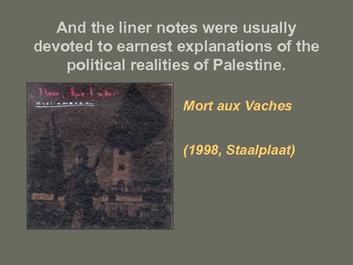 And the liner notes were usually devoted to earnest explanations of the political realities of Palestine. Mort aux Vaches (1998, Staalplaat)