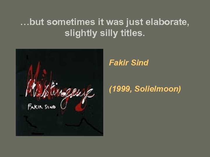 …but sometimes it was just elaborate, slightly silly titles. Fakir Sind (1999, Solielmoon)