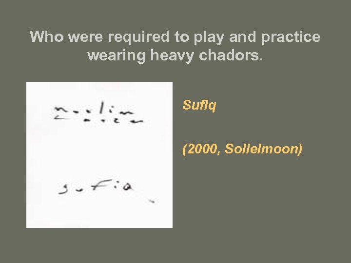 Who were required to play and practice wearing heavy chadors. Sufiq (2000, Solielmoon)