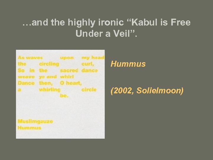 …and the highly ironic “Kabul is Free Under a Veil”. Hummus (2002, Solielmoon)