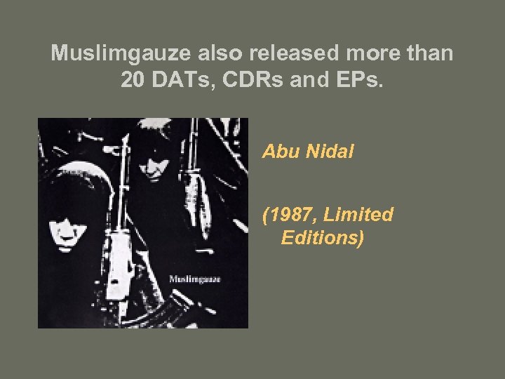 Muslimgauze also released more than 20 DATs, CDRs and EPs. Abu Nidal (1987, Limited Editions)