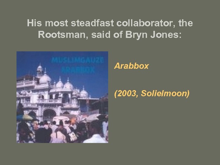His most steadfast collaborator, the Rootsman, said of Bryn Jones: Arabbox (2003, Solielmoon)
