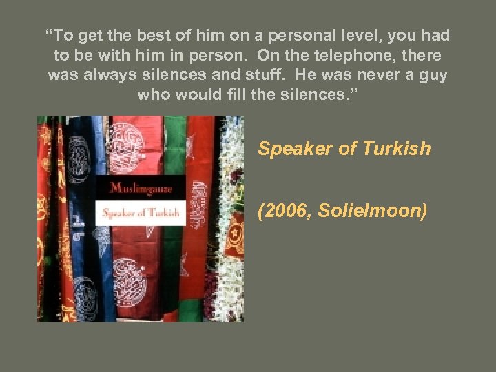 “To get the best of him on a personal level, you had to be with him in person. On the telephone, there was always silences and stuff. He was never a guy who would fill the silences. ” Speaker of Turkish (2006, Solielmoon)