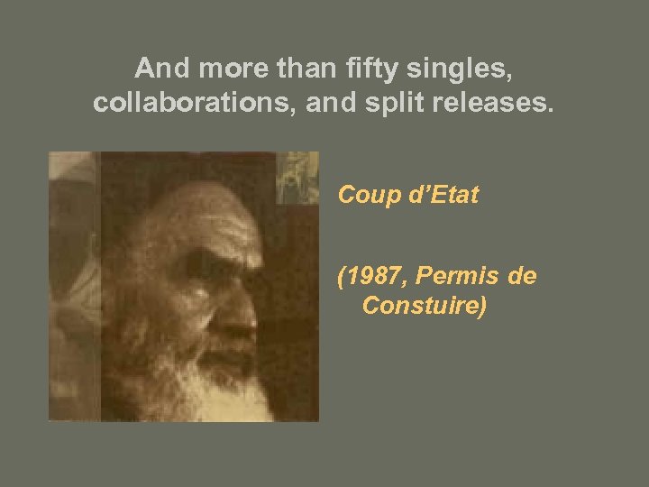 And more than fifty singles, collaborations, and split releases. Coup d’Etat (1987, Permis de Constuire)