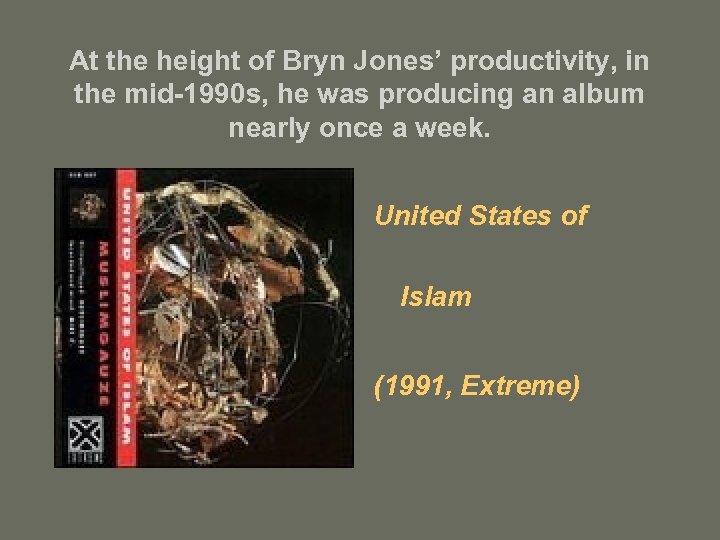 At the height of Bryn Jones’ productivity, in the mid-1990 s, he was producing an album nearly once a week. United States of Islam (1991, Extreme)