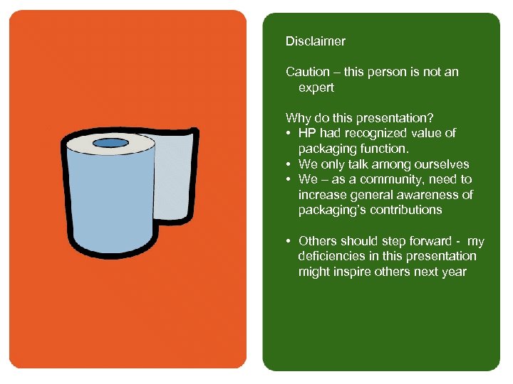 Disclaimer Caution – this person is not an expert Why do this presentation? • HP had recognized value of packaging function. • We only talk among ourselves • We – as a community, need to increase general awareness of packaging’s contributions • Others should step forward - my deficiencies in this presentation might inspire others next year