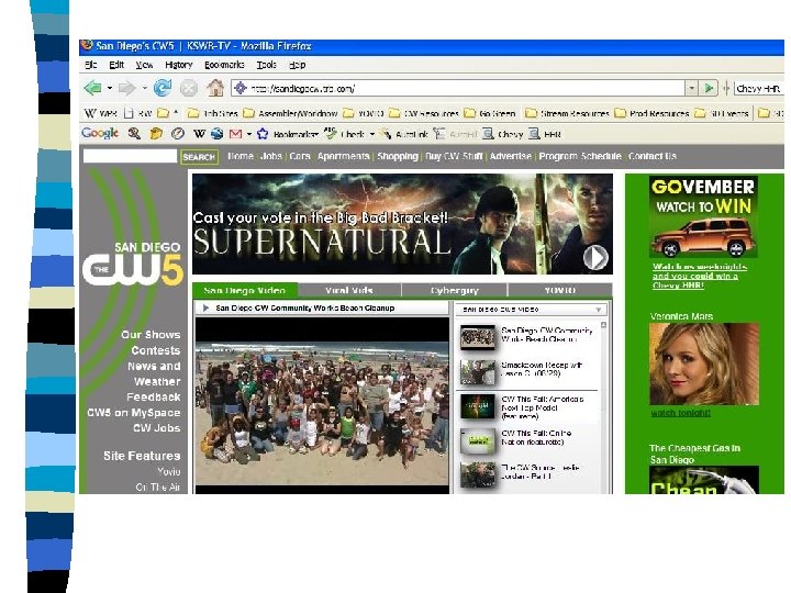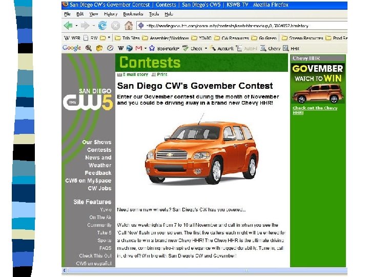 Go. Vember Driving viewership and building your brand awareness! In November, San Diego's CW will conduct an exciting watch to win contest, awarding a brand new featured Chevy HHR vehicle. This is an invaluable product integration and presentation platform, as the Chevy HHR will "star" in an extensive on-air campaign utilizing Chevy vehicle footage.