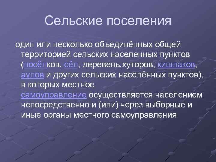 Сельские поселения один или несколько объединённых общей территорией сельских населенных пунктов (посёлков, сёл, деревень, хуторов, кишлаков, аулов и других сельских населённых пунктов), в которых местное самоуправление осуществляется населением непосредственно и (или) через выборные и иные органы местного самоуправления