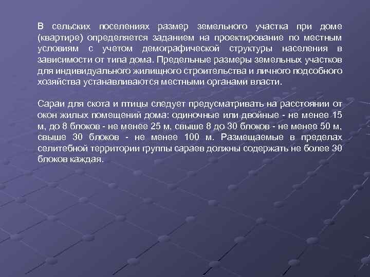 В сельских поселениях размер земельного участка при доме (квартире) определяется заданием на проектирование по местным условиям с учетом демографической структуры населения в зависимости от типа дома. Предельные размеры земельных участков для индивидуального жилищного строительства и личного подсобного хозяйства устанавливаются местными органами власти. Сараи для скота и птицы следует предусматривать на расстоянии от окон жилых помещений дома: одиночные или двойные - не менее 15 м, до 8 блоков - не менее 25 м, свыше 8 до 30 блоков - не менее 50 м, свыше 30 блоков - не менее 100 м. Размещаемые в пределах селитебной территории группы сараев должны содержать не более 30 блоков каждая.