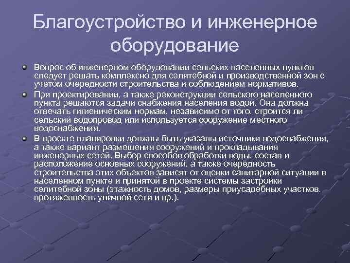 Благоустройство и инженерное оборудование Вопрос об инженерном оборудовании сельских населенных пунктов следует решать комплексно для селитебной и производственной зон с учетом очередности строительства и соблюдением нормативов. При проектировании, а также реконструкции сельского населенного пункта решаются задачи снабжения населения водой. Она должна отвечать гигиеническим нормам, независимо от того, строится ли сельский водопровод или используется сооружение местного водоснабжения. В проекте планировки должны быть указаны источники водоснабжения, а также вариант размещения сооружений и прокладывания инженерных сетей. Выбор способов обработки воды, состав и расположение основных сооружений, а также очередность строительства этих объектов зависят от оценки санитарной ситуации в населенном пункте и принятой в проекте системы застройки селитебной зоны (этажность домов, размеры приусадебных участков, протяженность уличной сети и пр. ).